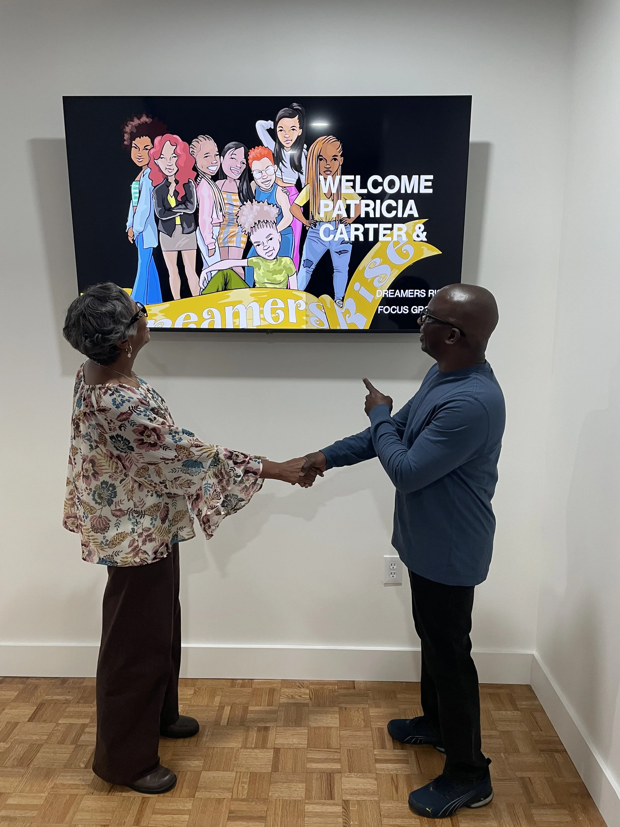 Guests entertained by three large monitors in the waiting area before entering the theater